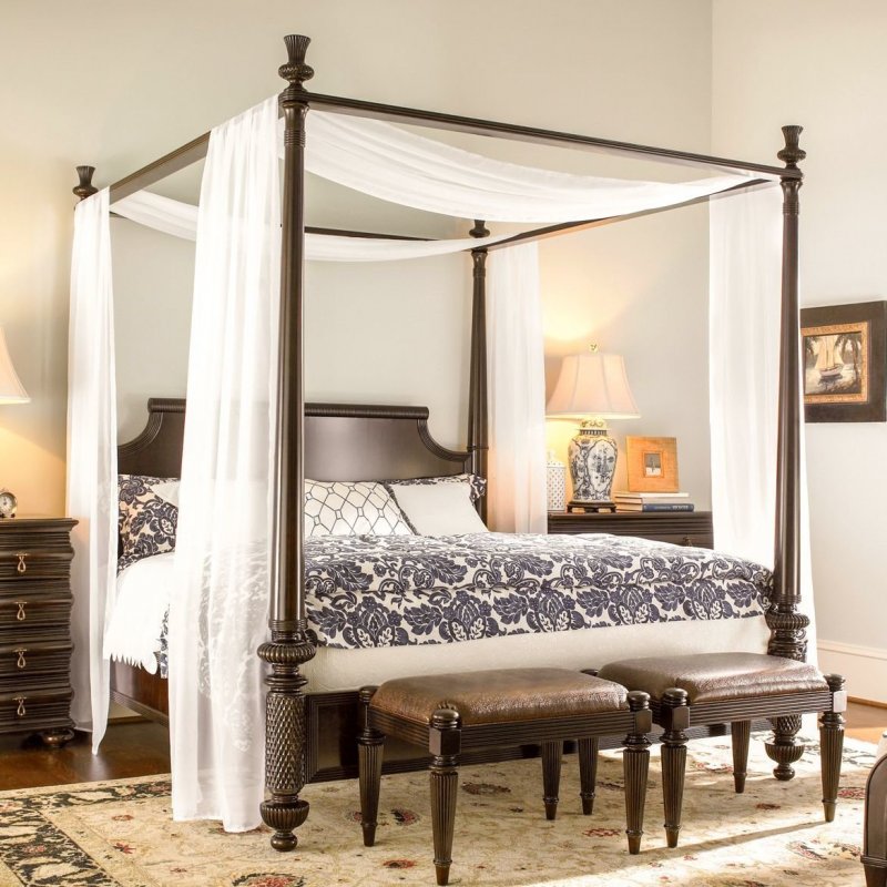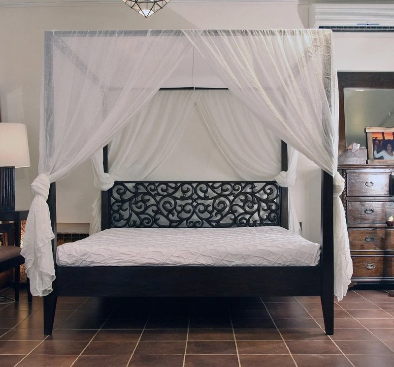 Полог над кроватью создает роскошное, эффектное оформление. Вокруг потребуется соорудить каркас под балдахин либо продлить вверх ножки, соединить их с квадратом верхних планок. Опоры выполняются круглого, квадратного сечения, бывают точеными, реже – асимметричной формы. Ткань, нитяная занавеска, подвешивается на верхние балки при помощи петель, крючков. Как вариант – текстильный материал завязывается на одном центральном крюке, расположенном над кроватью, свободные кончики закрепляются в четырех точках по углам спального места.