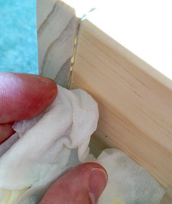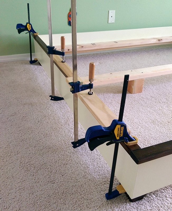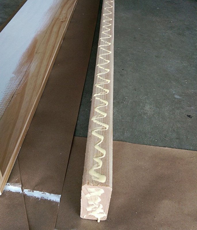 Далее производится декоративная отделка – на верх каркаса, низ и торцы планок, которыми будет оформляться изделие, «волнами» наносится клеевой состав. Планки прижимают струбцинами к основе, а чтобы они не оставляли следов, подкладывают обрезки досок, что увеличивает площадь прижатия в разы.