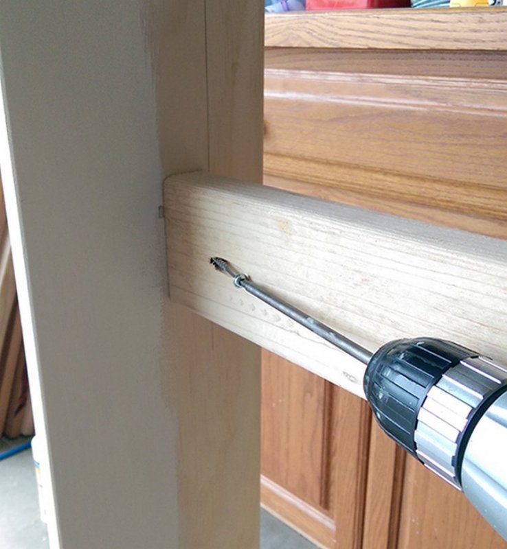 Центральная поддерживающая балка монтируется ровно по центру – на ее торцах под углом просверливаются по два отверстия. Деталь также крепится в 50-55 мм. от нижнего края каркаса – для этого под нее подкладывают брусочки нужной высоты, наносят на торцы клей, вкручивают саморезы. Оставшиеся после сверления выемки заполняют шпатлевкой, шлифуют мелкой наждачкой.