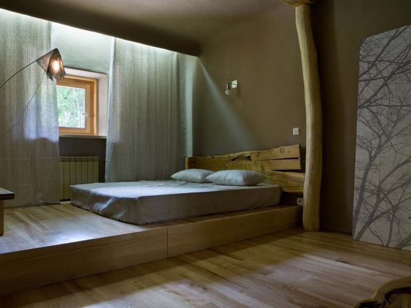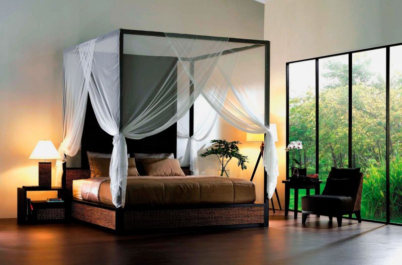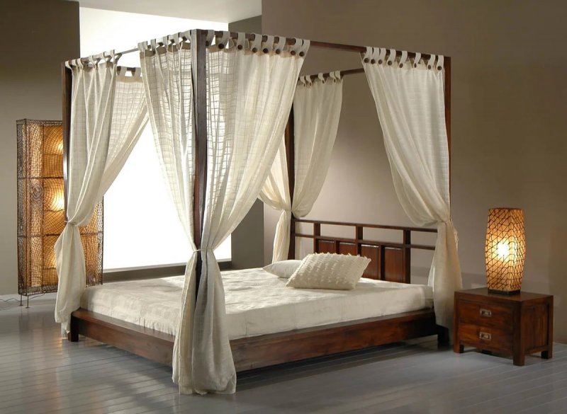 При создании экологического интерьера легкий полог крепят к настоящим толстым веткам, покрытым лаком, закрепленным по периметру ложа.