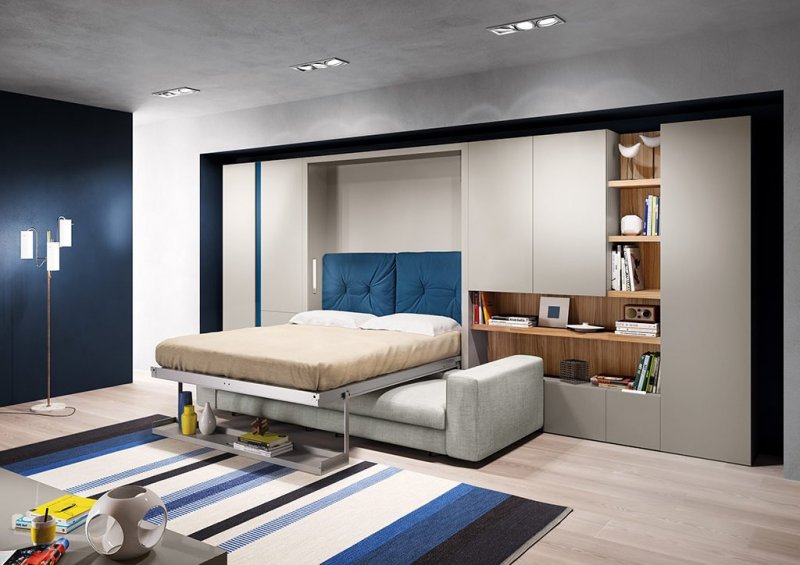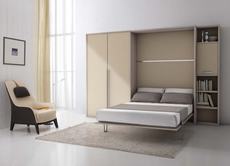 Кровать, трансформируемая в пристенный шкаф, оснащается подъемными механизмами. Сверху конструкции, расположенной изголовьем к стене, обычно имеются закрытые шкафчики-антресоли, сбоку – полочки, небольшой откидной столик, используемый в качестве прикроватного. Изделие, монтируемое к стенке боком, откидывается днем, образуя удобный рабочий стол, по бокам которого также выполняются многочисленные места хранения, на торце размещается большое зеркало, на другом – полочки под сувениры.