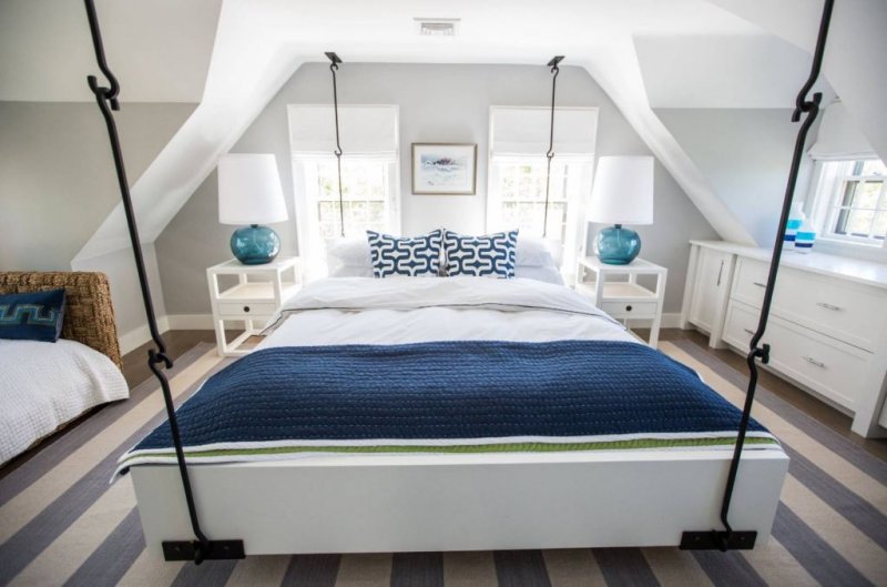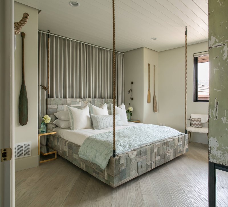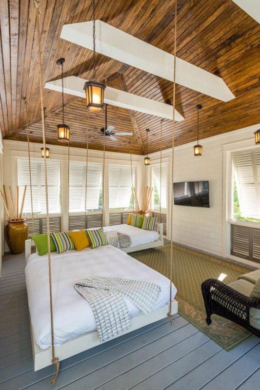 Простейшим подвесным спальным местом станет обычный гамак, круглое деревянное сооружение подойдет к стилю модерн, футуристическому, романтическому.