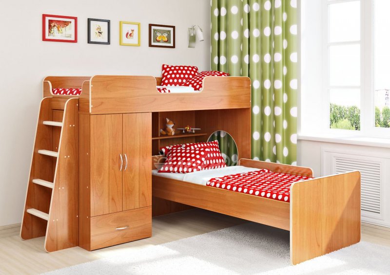 Верхняя койка двухъярусного сооружения для младших детей, должна иметь невысокие ограждения, препятствующие падению. То же самое касается лесенки, ведущей наверх.