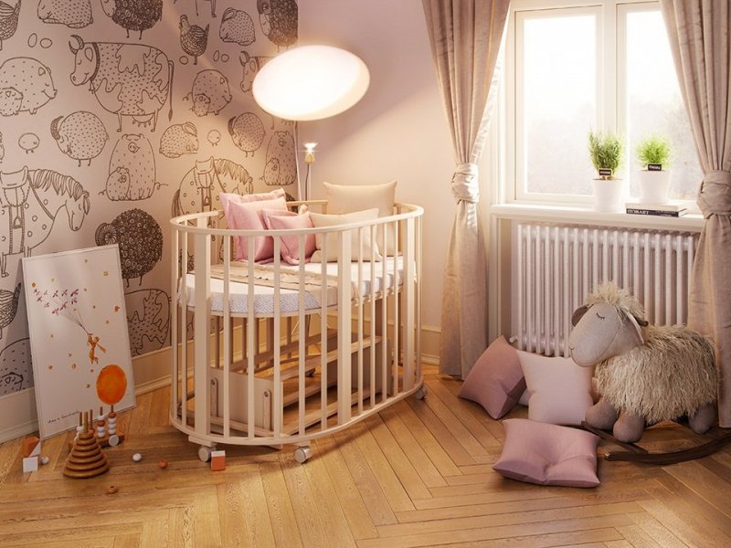 Приставная кроватка – отличный вариант для грудничков. Она имеет небольшие габариты – примерно 100 на 50 см, одну съемную стенку, регулируемую высоту низа. Конструкция пристегивается к кровати родителей, крепко фиксируется. Данная модель оснащается колесиками для легкого перемещения по квартире, выполняется прямоугольной, закругленной.