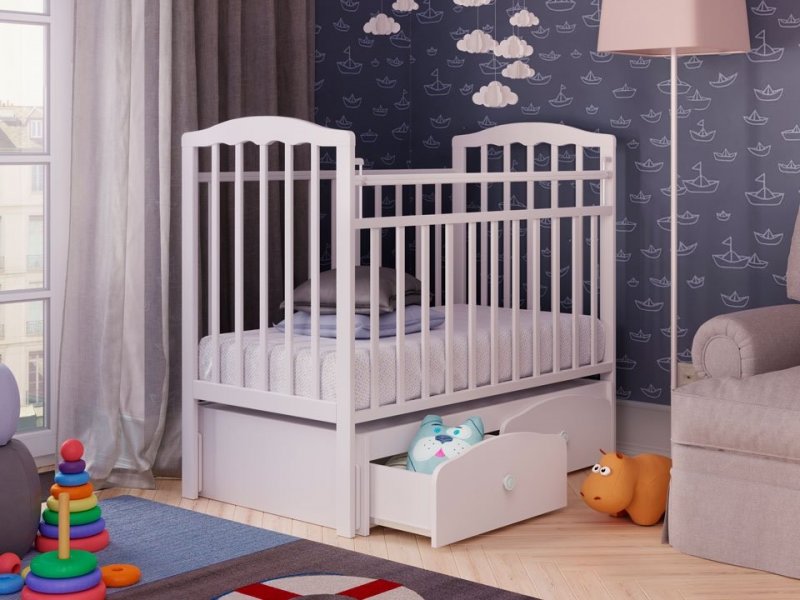 Расстояние между прутиками кроватки для младенца делается не более шести см. Бортики делаются съемными, стационарными. Ложе должно быть достаточно устойчивым – чем уже, выше модель, тем больше вероятности опрокинуть ее. Любые острые углы, различный травмоопасный декор запрещается.