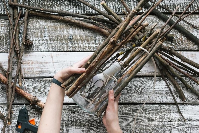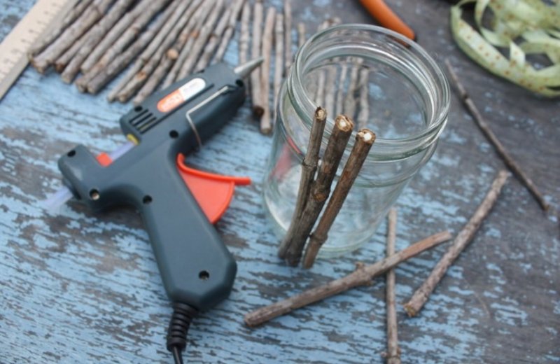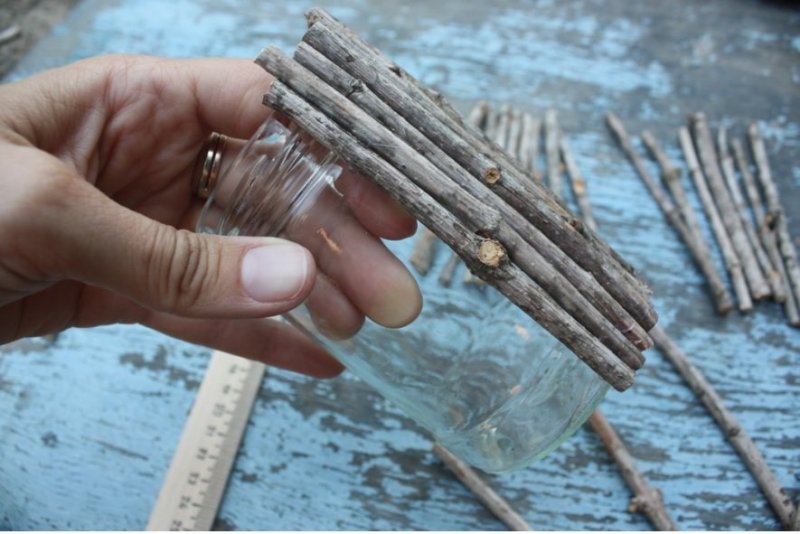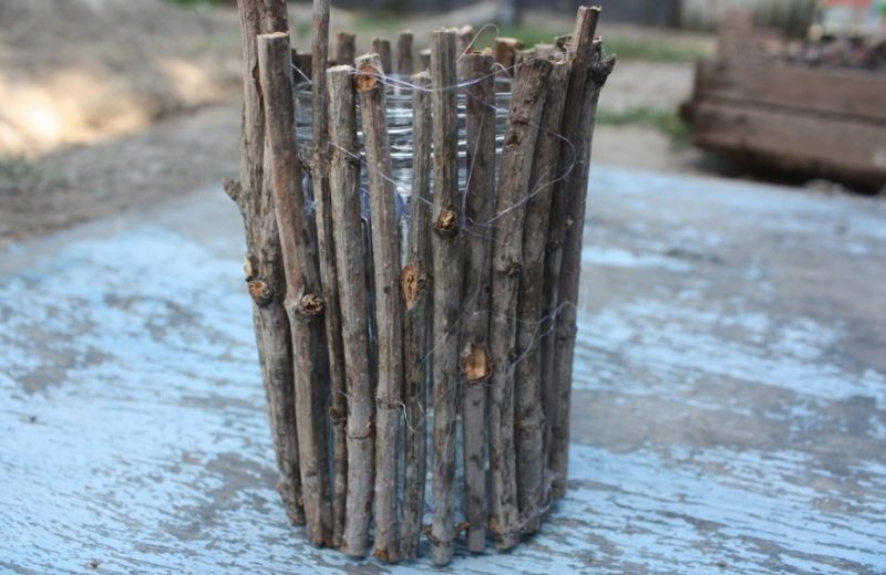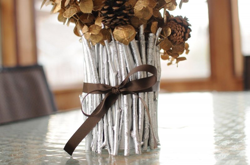 Из тонких веточек. В этом случае оклеивается стеклянная емкость: