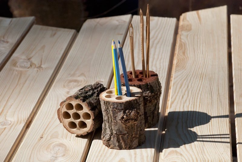 Ветками можно оклеить любой стакан, как в примере с вазой, использовать его для разных целей. Есть варианты интересных подставок для канцелярских принадлежностей из коряги, а также из пенька. Рассмотрим самый простой способ создания удобного элемента для размещения карандашей из спила:
