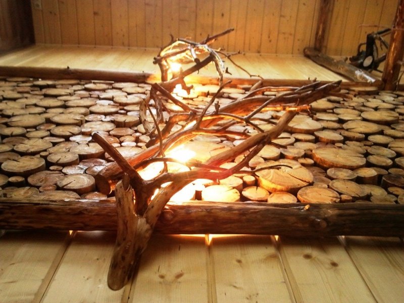 Благодаря неповторимым контурам, размерам, ветки очень эффектно выглядят в лучах искусственного света ламп и торшеров. Они приобретают причудливые узоры, создают иллюзию сказки и волшебства. Можно изготовить как сложные потолочные аксессуары для гостиной, так и маленькие светильники для прихожих и спален.