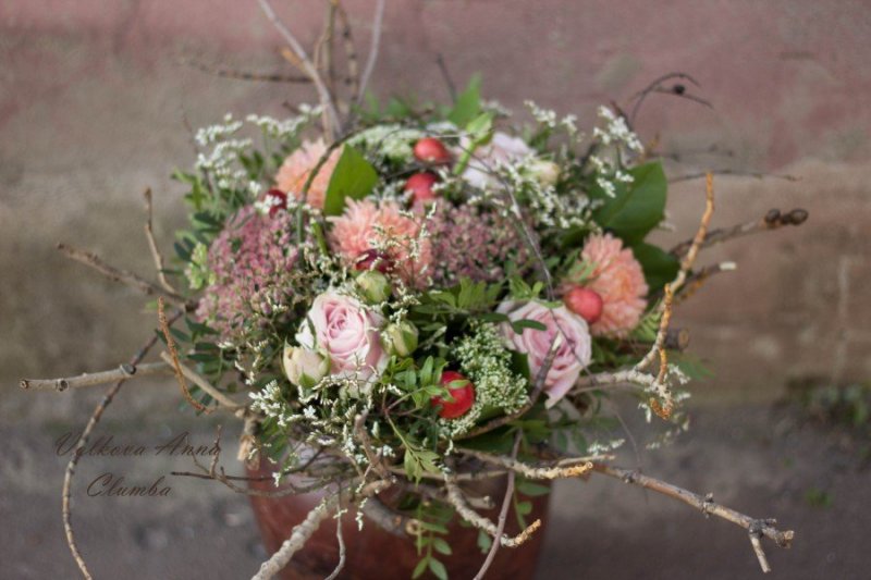 Оригинальные подарки, сделанные своими руками, всегда вызывают восхищение. Дополненный ветками цветочный букет выглядит стильно и натурально. Для изготовления понадобится лоза ивы, тонкие палки. В первую очередь готовим вазу. Сравниваем длину палочек, скручиваем проволокой в длинную дорожку. Размещаем на ней цветы, прутья на небольшом расстоянии друг от друга и скручиваем. Декорируем букет атласной лентой.