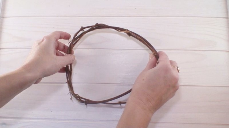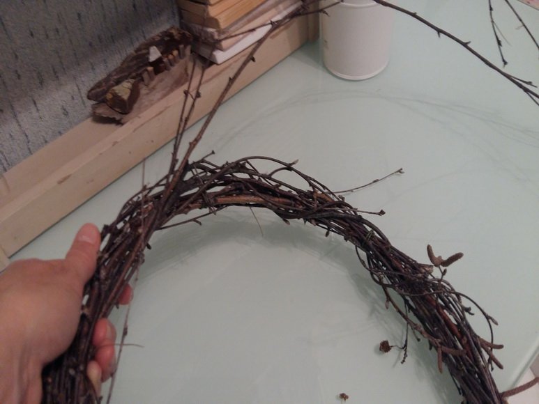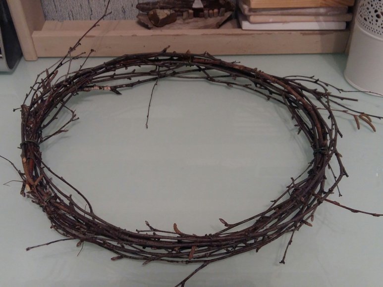 Изготовление венка начинается с создания основания. Для этого подойдут разные материалы. В работе будем использовать прутья березы, поэтому венок необходимо делать в тот же день, когда они собраны. Пошагово процесс выглядит так: