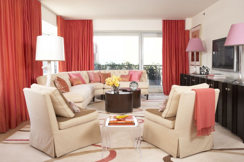 Одинаковая расцветка диванных подушек, ковра и портьер поможет создать красивые акценты в общем оформлении.