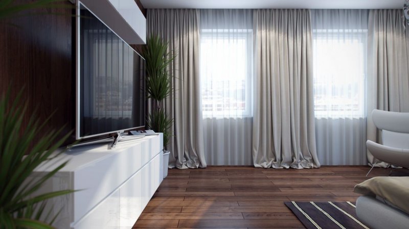 Такой вариант уместен для светлых комнат. Выбранные занавеси будут выступать ярким акцентом, притягивающим взоры именно к окну. Логичным будет декорирование подоконника живыми растениями, неброскими подушками или другим декором.