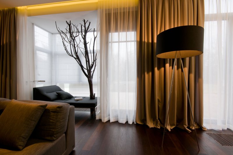 Выделяют оригинальность, элегантность и изысканность оформления. Льняное полотно такой длины можно использовать в лофт оформлении. Темные и нейтральные атласные шторы подойдут для классики, городского стиля. Полотна с изысканными рисунками, бахромой и ламбрекенами отлично украсят ар-деко и барокко.