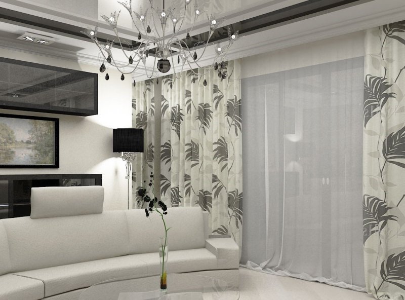 Поскольку гостиная комната предназначена для семейного отдыха и приема гостей, то в таком помещении можно вешать как яркие простые шторы, так и роскошные классические и итальянские модели. Выбор напрямую должен опираться на требования владельцев и создаваемую в этом помещении атмосферу. Так, в изысканной гостиной как нельзя лучше будут смотреться австрийские, итальянские модели в пол. А вот в яркой современной гостиной можно обойтись короткими полупрозрачными занавесками с яркими узорами. Хорошо будут смотреться и японские модели с крупным узором на каждом полотне. Что касается помещений с эркерами, в которых расположен диван для отдыха, то их можно украсить шторами любой длины. Такой уголок будет хорошо обрамляться как простыми рулонными моделями, так и изысканными австрийскими портьерами.