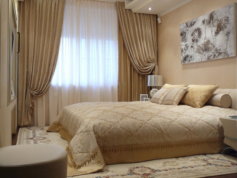 В современной спальне (а также в модерне и хай-теке) хорошо будут смотреться короткие шторы, которые будут лишь дополнять интерьер помещения. Для комнат, оформленных в светлых тонах или имеющих нестандартное оформление (барокко, ар-деко, прованс), лучше повесить полотна до пола или в пол. Не рекомендуется подбирать портьеры с многочисленными сборками, если хозяева желают подчеркнуть простоту оформления. И, наоборот, для придания роскоши станут необходимы ткани с оригинальной подачей, дополненные узорами и украшенные ламбрекенами. При наличии эркера или полуэркера стоит позаботиться о потолочном размещении полукруглого карниза, который поможет стильно обрамить оконный проем. Также изюминкой выбранной занавески в провансе или классическом направлении может стать деревянный ламбрекен. Правда, подбирать его следует в соответствующей подаче: для прованса в белом колере, для классики в более строгом темно-коричневом цвете.