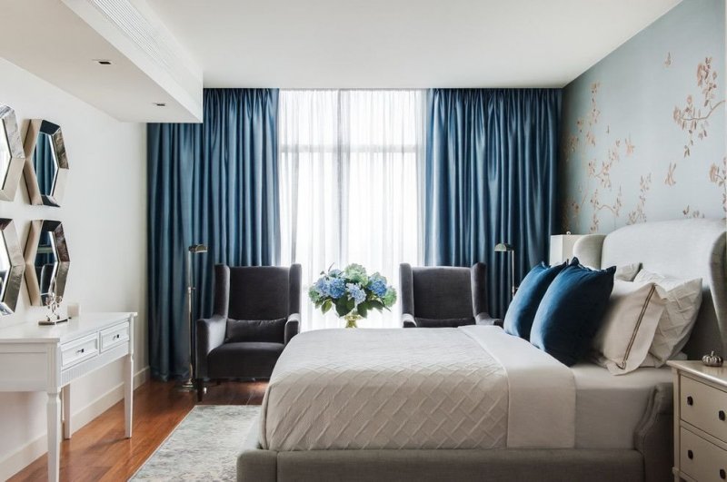 Для такой схемы выбираются шторы и пара кресел (или небольшой диван) в одном цвете. Мягкая мебель будет располагаться перед окном, на балконе или в противоположном углу комнаты.