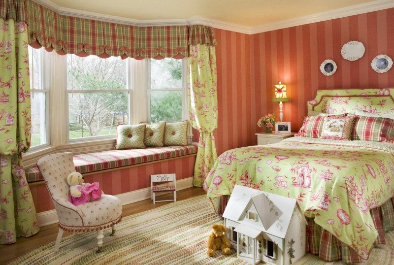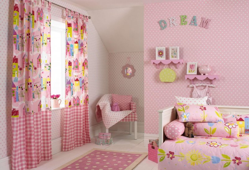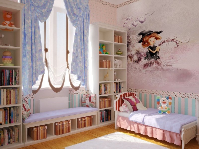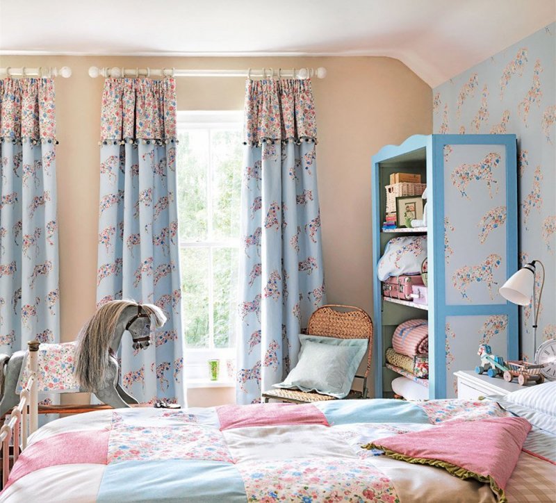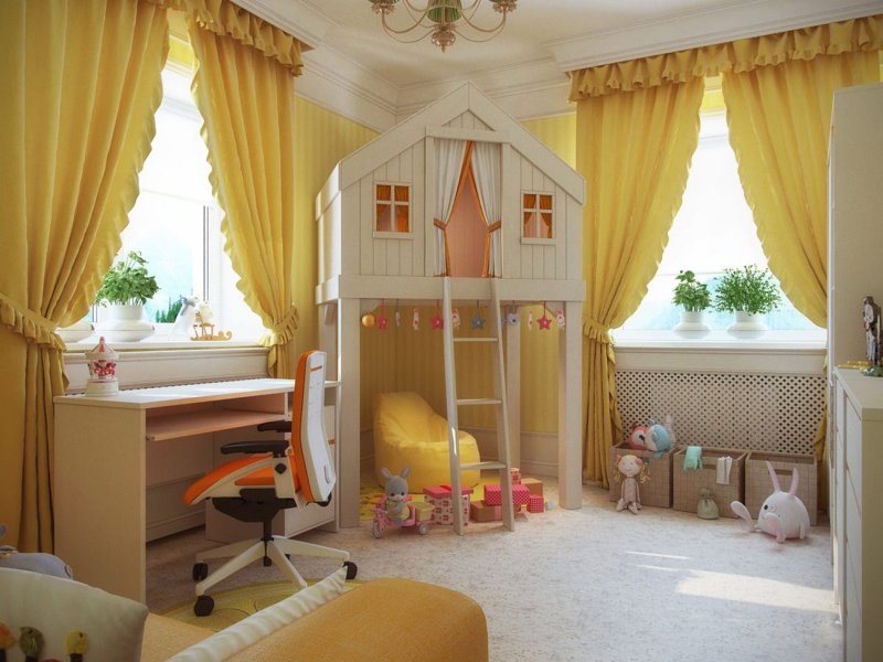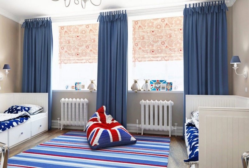 В детской комнате уместными будут шторы до подоконника и чуть ниже подоконника. Длинные полотна нельзя считать подходящим вариантом: если ребенок будет играть возле окна, он может случайно зацепить изделие и в худшем случае сорвать портьеру с карниза. В детских комнатах рекомендуется вешать комбинированные изделия: портьеры с тюлем. Они обеспечат хорошую защиту помещения от яркого солнца в дневное время (даже если ребенок уже не спит днем), предупредят проникновение света от фонарей, луны в комнату ночью. Оптимальными вариантами можно считать рулонные, французские, австрийские модели. Стильно дополнить комнату малыша смогут и римские шторы или плиссе. Правда, чистку многослойных полотен лучше проводить каждый день или через день. Это позволит поддерживать здоровую атмосферу в помещении и исключит скопление пыли в складках ткани.