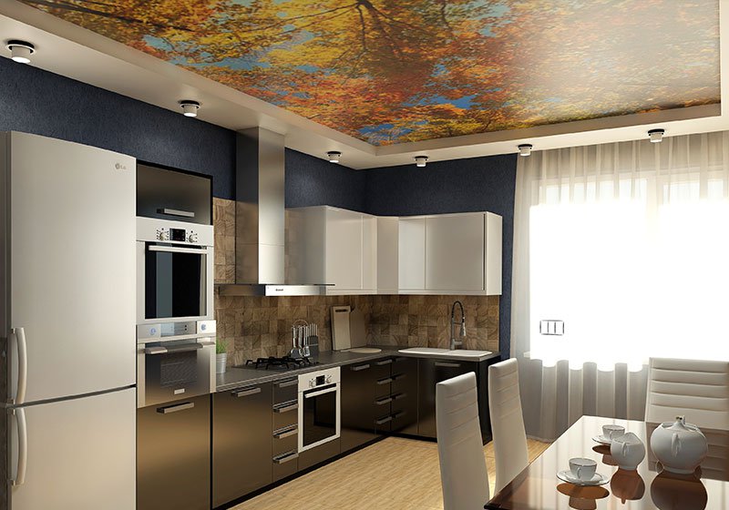 С помощью двухуровневого потолка делают разделение кухонного пространства на рабочую зону и место отдыха, приема пищи. Над обеденным столом располагают самую низкую часть конструкции. Это дает возможность использовать максимум освещения, украсить поверхность осветительными приборами любого типа. Столешницу, мойку, плиту и холодильник помещают в зону без потолочного освещения. Рабочим поверхностям вполне хватит освещения, встроенного в гарнитур, вытяжку.