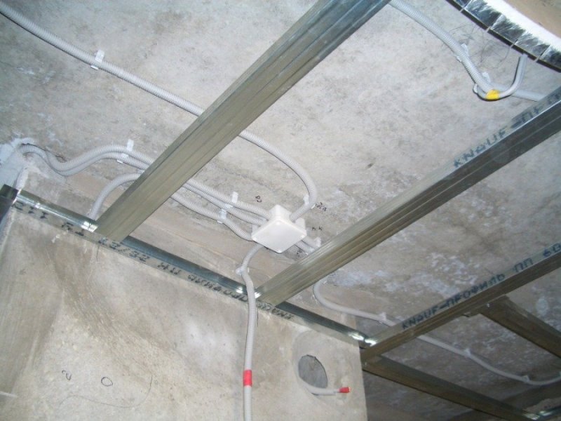Провода для будущих светильников надо вывести и отметить места крепления ламп и люстр. Потолочная поверхность не обязательно должна быть ровной, все недочеты будут спрятаны под коробом прочного материала.