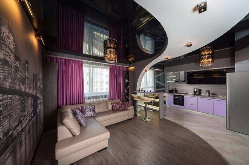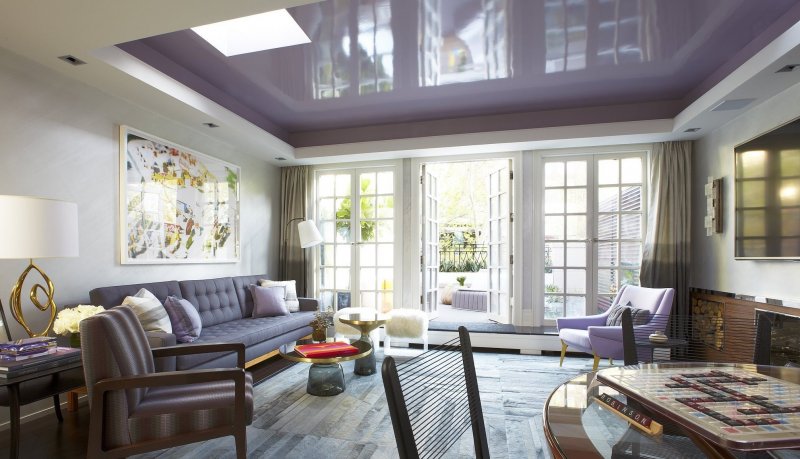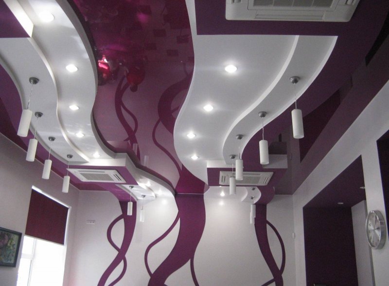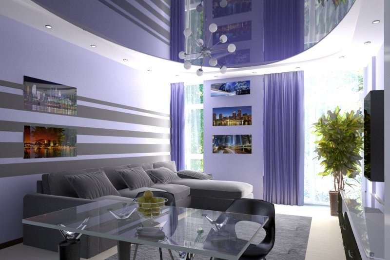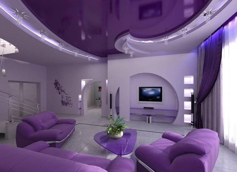 Для оформления жилых комнат часто берут синий, голубой тон. Например, делают комбинированные конструкции, где гипсокартон окрашен светлым, а натяжное полотно – в фиолетовый. Голубой цвет можно использовать при обустройстве туалета, ванной, синий в небольшом количестве – для спальни, детской, фиолетовый – в гостиной. На кухне или в кабинете можно применить красный и оранжевый. Они возбуждают, стимулируют умственную деятельность.