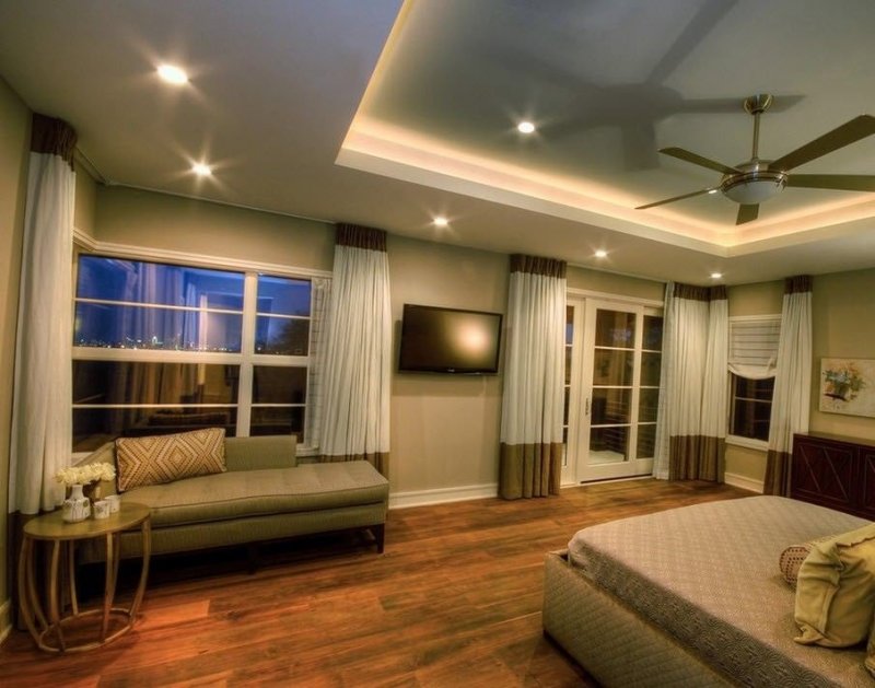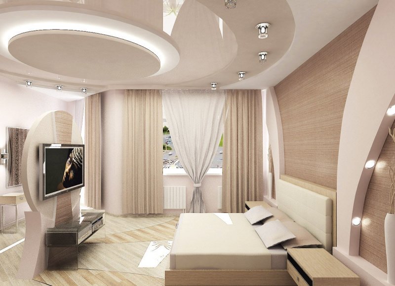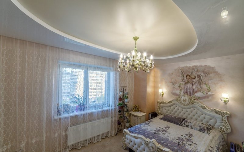 Хорошо смотрятся в спальне комбинированные уровневые потолки. В выборе дизайна полет фантазии неограничен. Можно комбинировать дерево и гипсокартон, текстиль и ПВХ. Ярусы высоких потолков можно украсить лепниной, сделать проекцию «звездное небо».