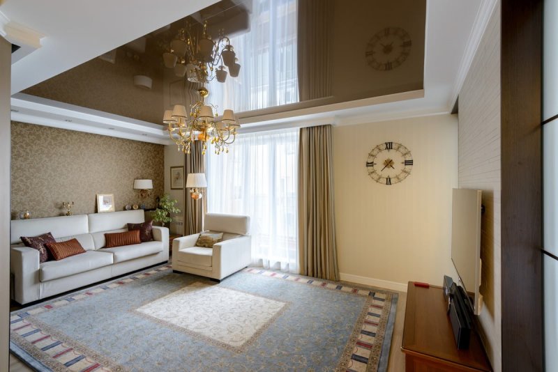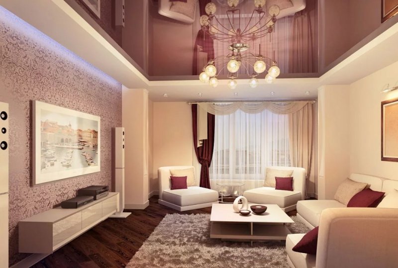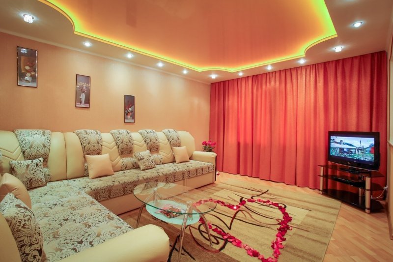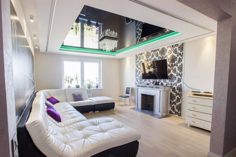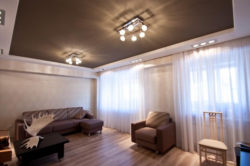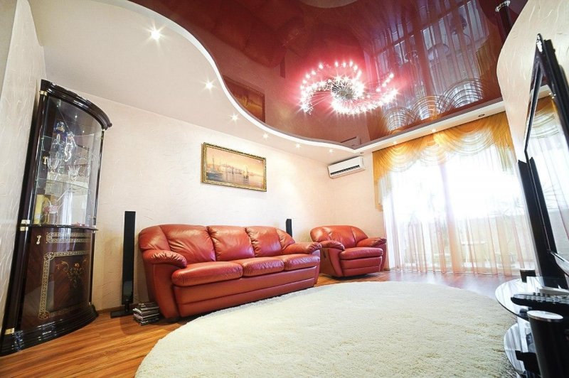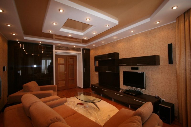 В комнате отдыха потолок в два яруса играет декоративную роль. Он первый бросается в глаза при пробуждении и последний провожает в сон. Благодаря конструкции можно использовать освещение различной интенсивности, создавать красивый рельеф и невообразимые линии. На большой платформе в центре размещают красивую люстру, по периметру можно расположить светодиоды. Подсветка с плавными, мягкими переходами создает романтическое настроение.