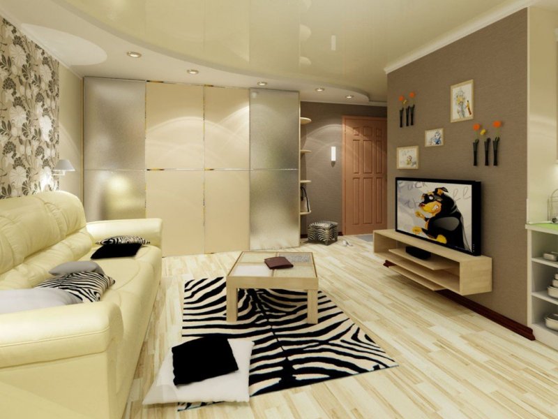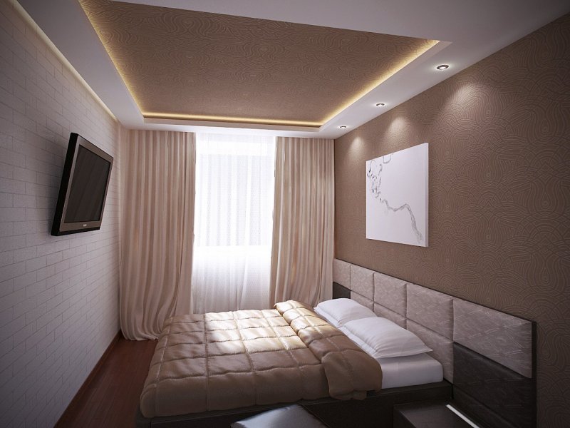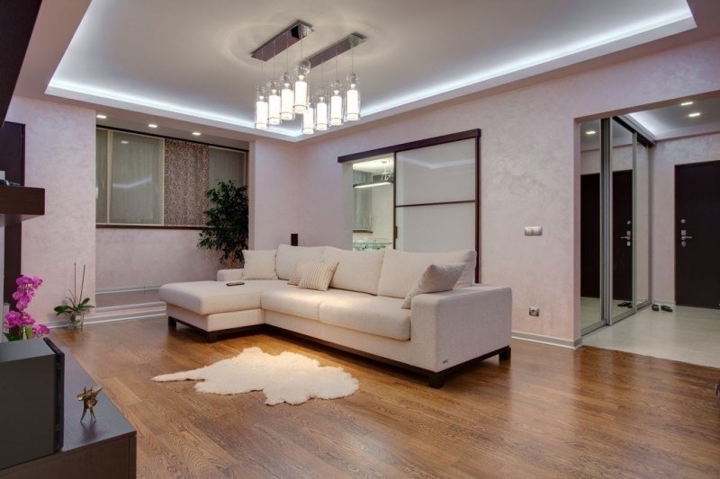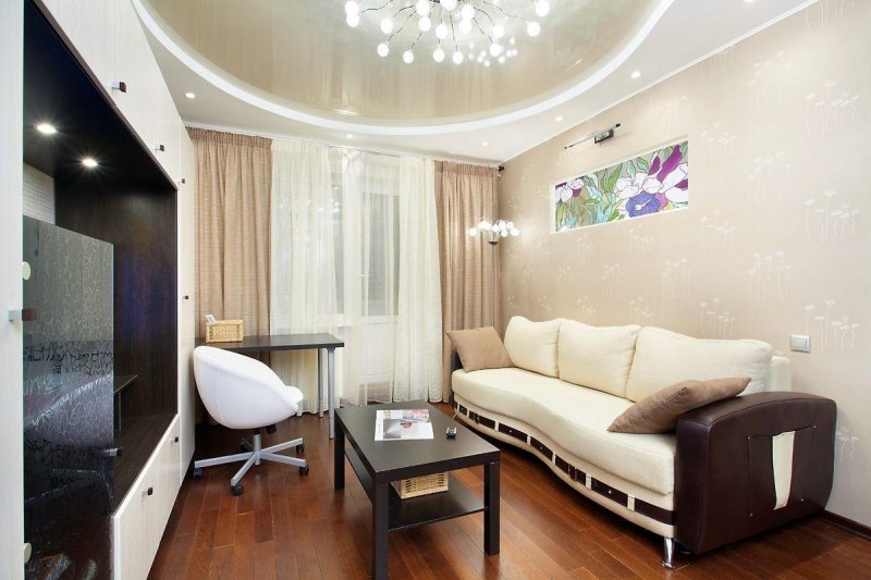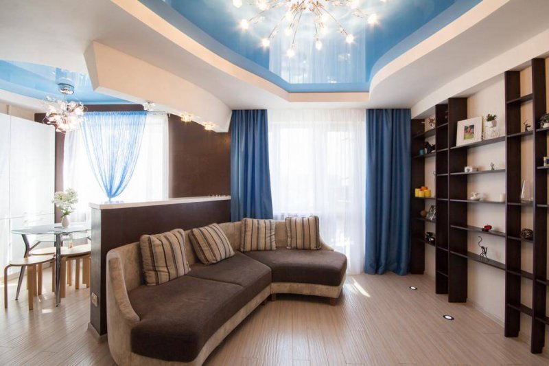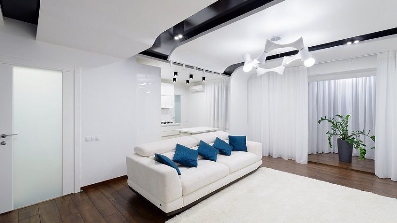 Благодаря особенностям крепления двухуровневые потолки могут монтироваться в небольших по площади комнатах. Мягкое, жесткое полотно будет крепиться всего в нескольких сантиметрах от потолка, что позволит осуществить монтаж практически без потери высоты помещения. Ограничить свободу выбора типа полотен могут только размеры и модели светильников. Большое разнообразие современных потолочных материалов позволяет собрать конструкцию даже в комнатах, площадь которых ранее этого делать не позволяла.