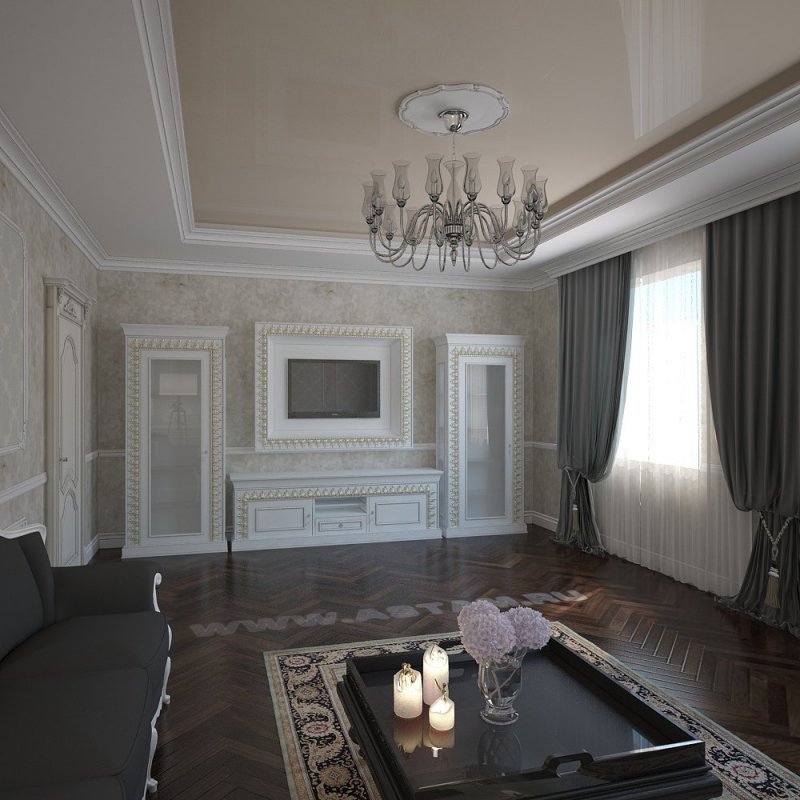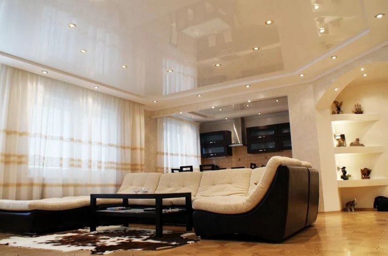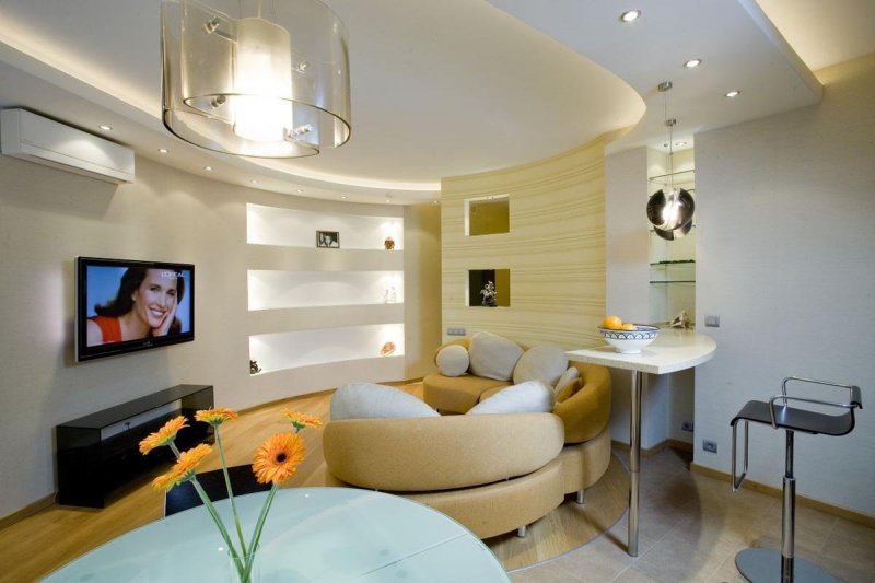 В интерьерах гостиных часто встречаются потолки изогнутой формы из гипсокартона. Плавные линии с подсветкой создают впечатление динамичности пространства и текучести. Такой эффект должен поддерживаться планировкой и динамикой цвета. С помощью двухуровневого потолка можно изменить геометрию гостиной, создать в комнате общего пользования определенное настроение.