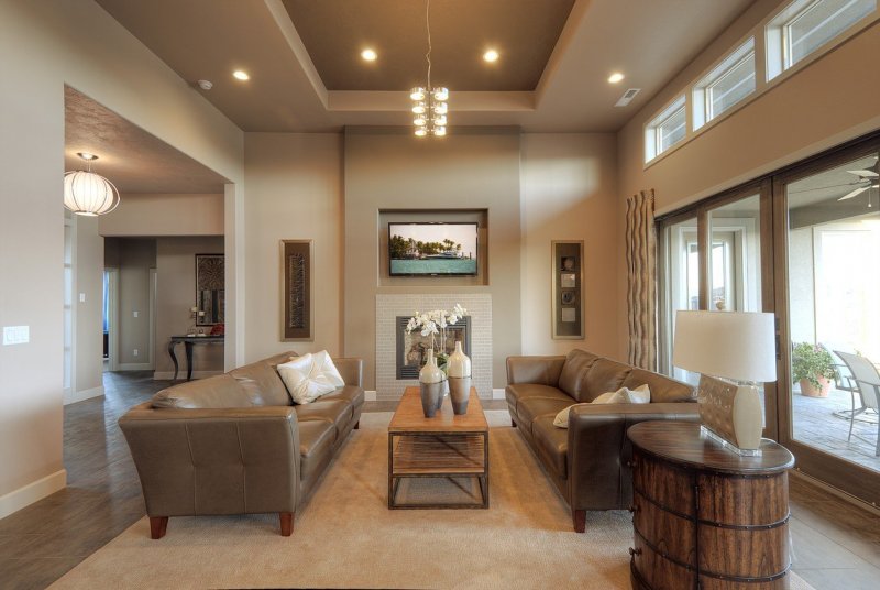 Обычно в просторной комнате двухуровневые потолки используются с целью зонирования пространства. Над местом отдыха с диваном и телевизором размещают низкую часть потолка. Это может быть участок у стены или центр гостиной. Рабочую или обеденные зоны обозначают высокие участки. Такой способ разделения подходит для больших помещений, в остальных случаях лучше использовать мебель и перегородки.