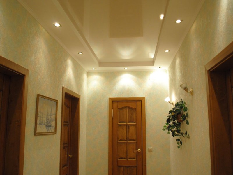 Самый распространенный способ обустройства потолка в два яруса – сооружение рамки по периметру прихожей, которая спускается на несколько сантиметров ниже основного покрытия. Своеобразная окантовка может быть гладкой, рельефной, любой ширины и размера. Боковые коробки обычно используют для монтажа светильников. Так, основное полотно остается нетронутым, без вмятин и проколов.