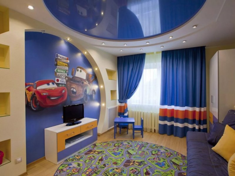 Многоуровневые потолки в детской с подходящим по возрасту принтом не должны быть долговечными, поскольку ребенок вырастет и потеряет интерес к картинке. В подростковой комнате потолок должен соответствовать общему стилю помещения.