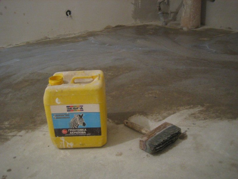 Для хорошего сцепления стяжки с основанием потребуется обработать поверхность бетонокантактом или акриловой грунтовкой. Обнаруженные щели и дыры надо заделать. Лучше сделать несколько слоев грунта. Впитывающая способность пола уменьшится максимально, что позволит смеси не терять быстро влагу, постепенно и равномерно высыхать.