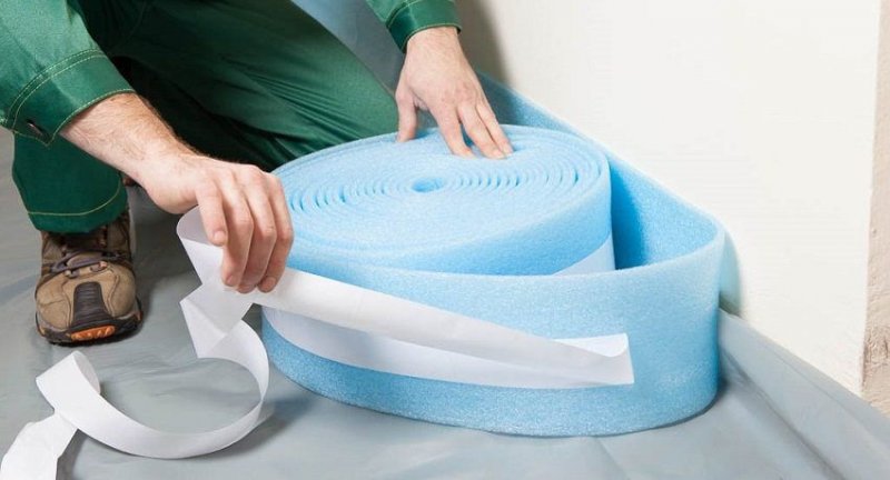 Для стяжки используют ленту шириной 10-15 см. Для работы подойдет только целый материал с хорошей клеевой поверхностью. Высокое качество работ обеспечит лента кнауф. Ее монтаж начинают до процесса заливки. Демпферной лентой следует оклеить часть стены у пола по всему периметру комнаты. Все выступы, колоны также должны быть защищены.