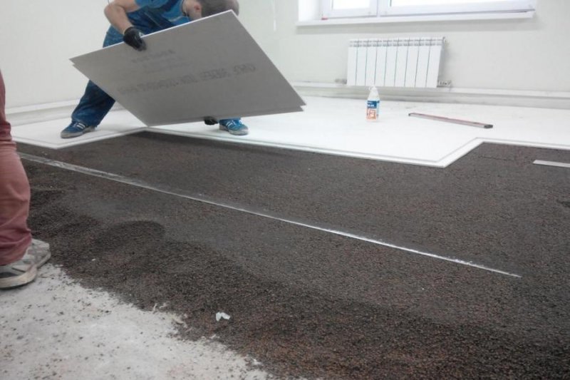 После окончания черновых работ можно делать засыпку стяжки. Предварительно рассчитанный объем наполнителя высыпают на пол и разравнивают, опираясь на маяки. Затем укладывают листы ГВЛ. Работу на большой площади проще проводить поэтапно, частично высыпать смесь и делать накрывание.