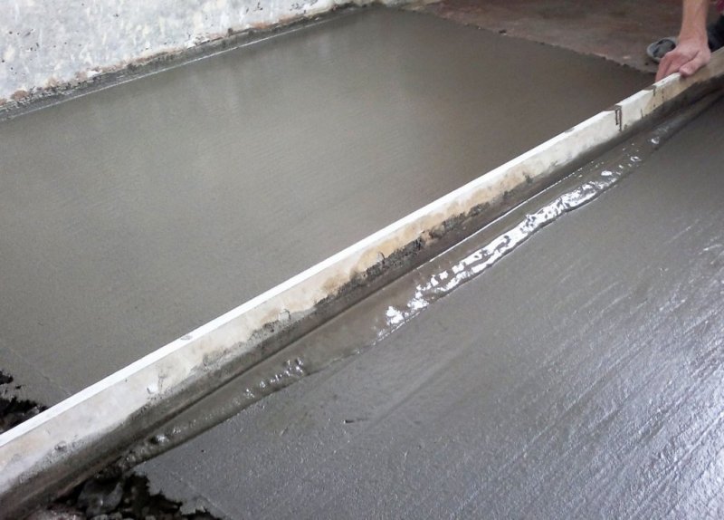 Перед тем как переносить раствор на пол необходимо зарисовать или сфотографировать проходящие коммуникации, чтобы при необходимости ремонта быстро их найти. Заливку начинают от противоположного угла к выходу из помещения. Раствор выливают между двух маяков и выравнивают с помощью правила зигзагообразными движениями. Излишки убирают в ведро, в места выемок добавляют смесь.