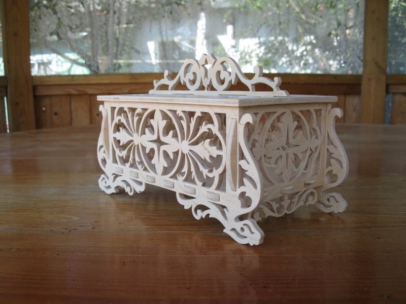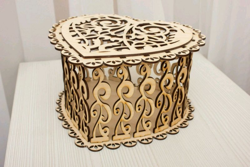 Для того, чтобы изготовить ажурную шкатулку, необходимо выбрать дизайн и подготовить подробный чертеж деталей будущего изделия. Далее формируем лист раскроя и переносим контуры элементов на фанерный лист. При наличии лобзика вырезать части шкатулки не составит труда.