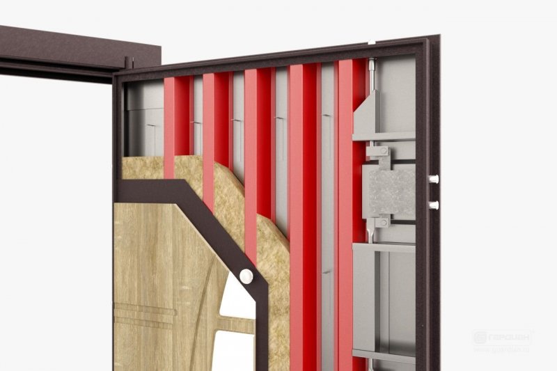 Конструкция металлической входной двери представляет собой многослойный пирог. В качестве внешних слоев выступают стальные пластины, которые усилены изнутри с помощью ребер жесткости. В качественных дверях должно присутствовать как минимум три подобных элемента – один горизонтальный и пара вертикальных. Но чем больше в конструкции ребер жесткости, тем более прочным, тяжелым и надежным будет дверное полотно.