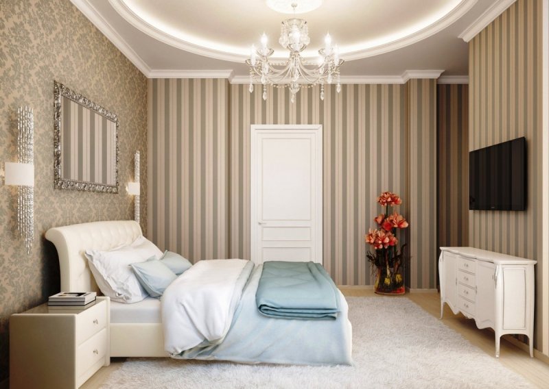 Хорошо в спальне будут смотреться мелкие, крупные геометрические фигуры, цветы, листья и ветки. Жидкими обоями оформляют часть у изголовья кровати. На маленькой площади будут уместными фактурные обои без дополнительного декора в виде картин и фоторамок. Рельефная текстура подчеркнет игру света и тени, что сделает комнату более просторной.