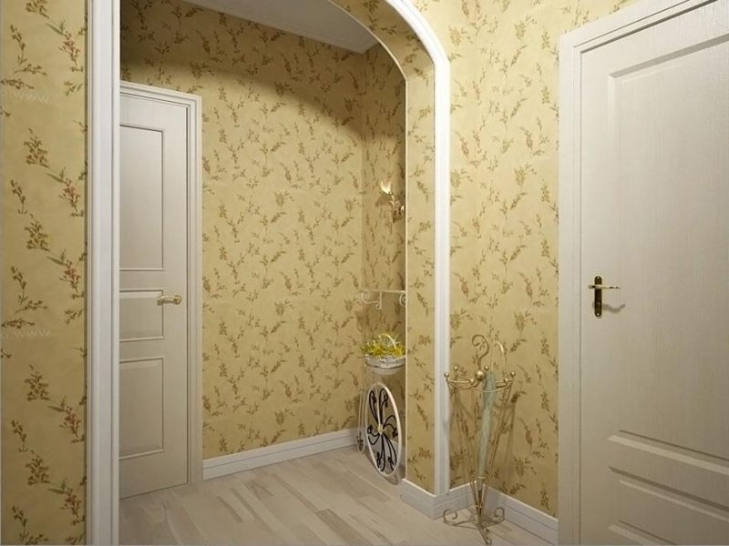 Визуально увеличить пространство коридора можно с помощью однотонных светлых полотен на основе винила или акрила. Рисунок выбирают исходя из размеров и прочих особенностей помещения. Для самостоятельной оклейки подойдут тяжелые флизелиновые обои, которые можно подгонять прямо на стене. Комната с повышенной проходимостью редко оснащена естественными источниками света, поэтому беспокоиться о выгорании полотен нет необходимости.