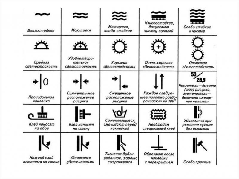 Полотна любого типа маркируются по единому стандарту. Рисунки и пиктограммы на этикетке говорят о важных характеристиках настенного покрытия. Обозначения расшифровываются следующим образом: