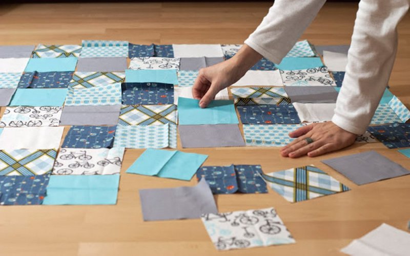 Шить изделие начинают с раскроя материала – все штаны разрезаются на квадраты одинакового размера. Каждый квадратик обметывают, подворачивают края, после чего все элементы сшивают друг с другом. Допустимо использовать и элементы различной формы, но такой вариант достаточно сложен. Важно придерживаться единой техники сшивания:
