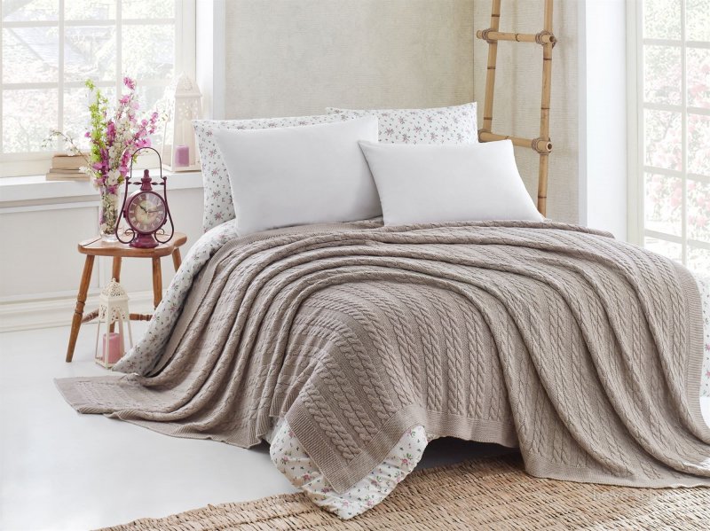 Предмет, связанный спицами, наполняет комнату уютом, теплом. Такое покрывало выполняется сплошным либо составляется из отдельных кусочков. Первый вариант создается из шерстяных либо синтетических цветных ниток. Перед началом вязания желательно связать небольшой образец, при помощи которого определяется, сколько петель приходится на 1 или 10 см. Выбранным узором вяжут кусочек, размером минимум 10 на 10 см, измерение проводят линейкой. Примерное количество петель для двуспального покрывала 450-500, число рядов – 550-700.