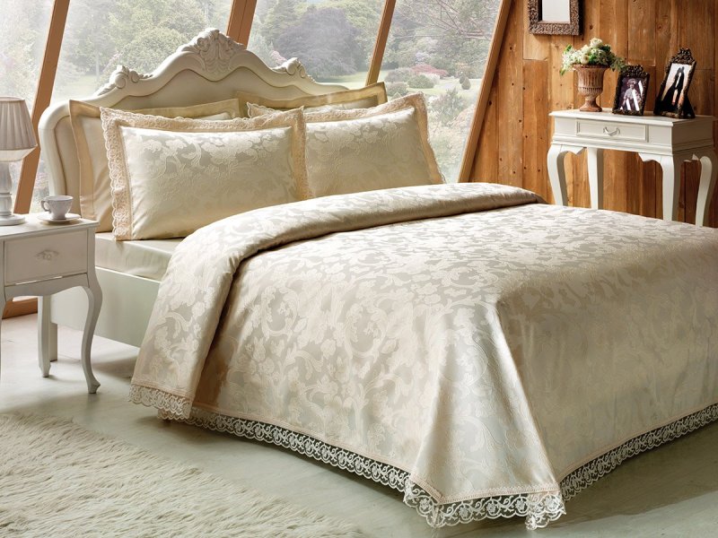 Покрывало-чехол плотно облегает верхнюю часть конструкции, его размеры подбираются под габариты матраса, с учетом того, что на последнем разместится постельное белье, одеяло. Иногда к такой вещи пришивается резинка. Это идеальный вариант, если деревянные части кровати «богаты» фактурной резьбой, росписью или ложе полностью выполнено из ротанга.