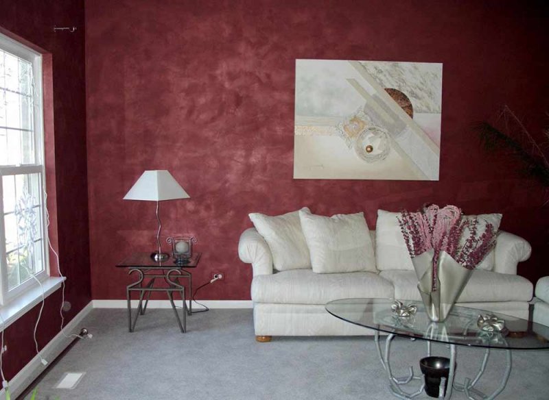 Первый слой наносят на стену широкой кистью, простым валиком. После используется валик, имеющий сложную фактуру (оформленный волнами, цветами, геометрическими фигурами, «кирпичиками»), собственные ладони, скомканные полимерные пленки, а также контрастные тона красок. Если это первое окрашивание в жизни, работу начинают с самых малозаметных участков – если начало выйдет не слишком качественным, здесь дефекты скроются за мебелью, декором, занавесками.