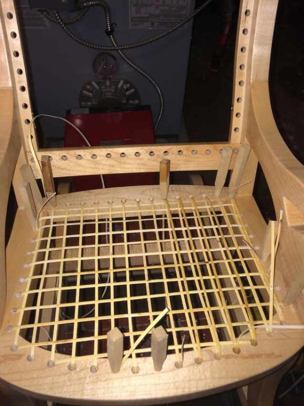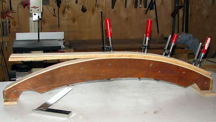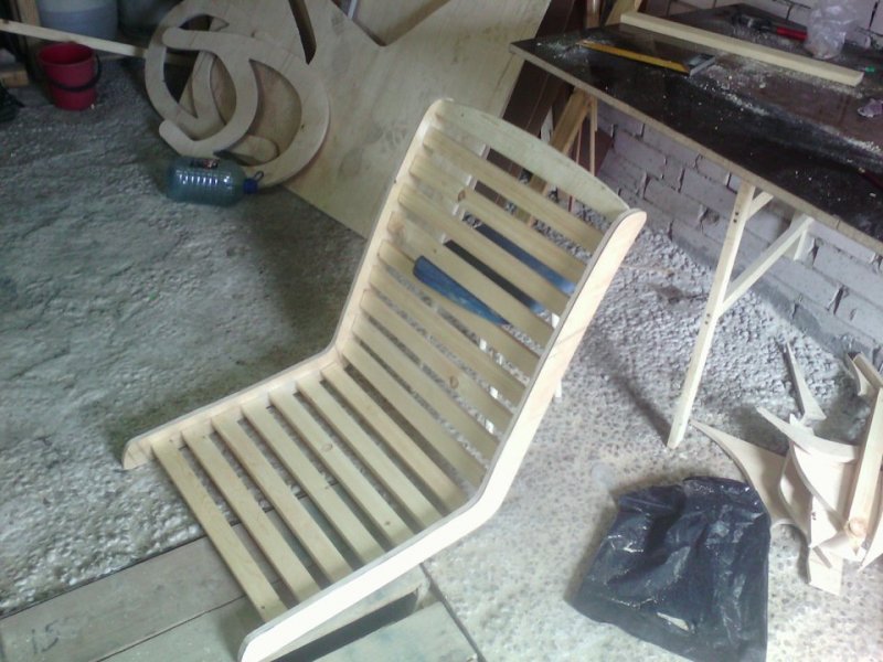 Фанерная конструкция состоит из двух боковин, трех поперечных царг, нескольких десятков ламелей спинки и сидения. Средние габариты – 150 на 110 на 72 см. Данное изделие не имеет подлокотников, что значительно упрощает процесс изготовления.