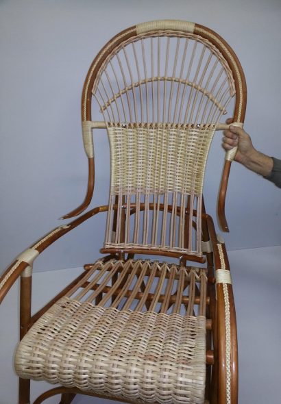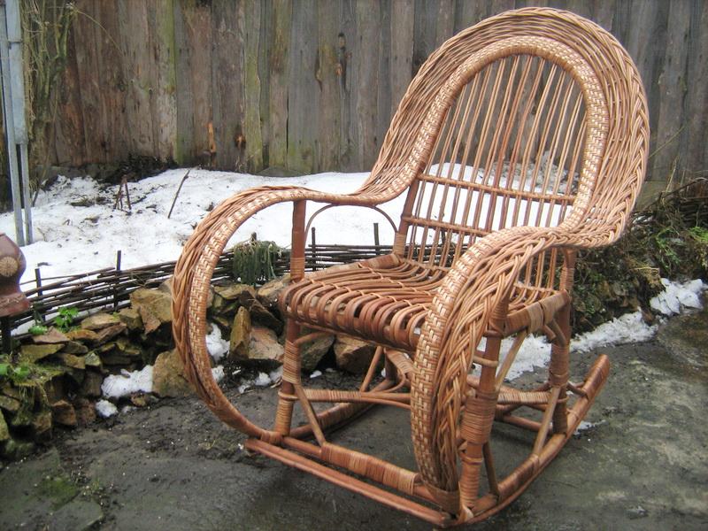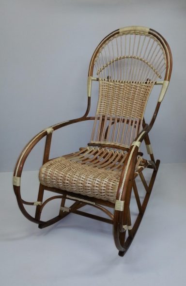 «Классическая» качалка плетется из ивовой лозы – она выходит легкой, ажурной, оптимально подходит для сада, этнических, эко-интерьеров. Сам каркас выполняется из прутьев или лиан, толщиной три-четыре см, оплетка – из совсем тоненьких. Отдельные соединения делаются из пеньки, кожаных ремней. Готовое изделие окрашивается, покрывается лаком.