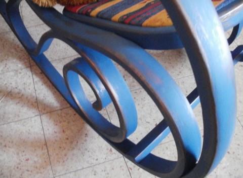 Когда каркас полностью целый, полозья не стерты, требуется обновить лишь покрытие. Для начала конструкцию, при помощи специальных насадок на дрель, избавляют от старых лакокрасочных покрытий, шпаклюют места, где имеются трещины, сколы. Зашкуренные до дерева детали покрывают морилкой, просушивают четыре-шесть часов, наносят один-два слоя мебельного лака. Каждый слой последнего просушивают как минимум 20 часов.