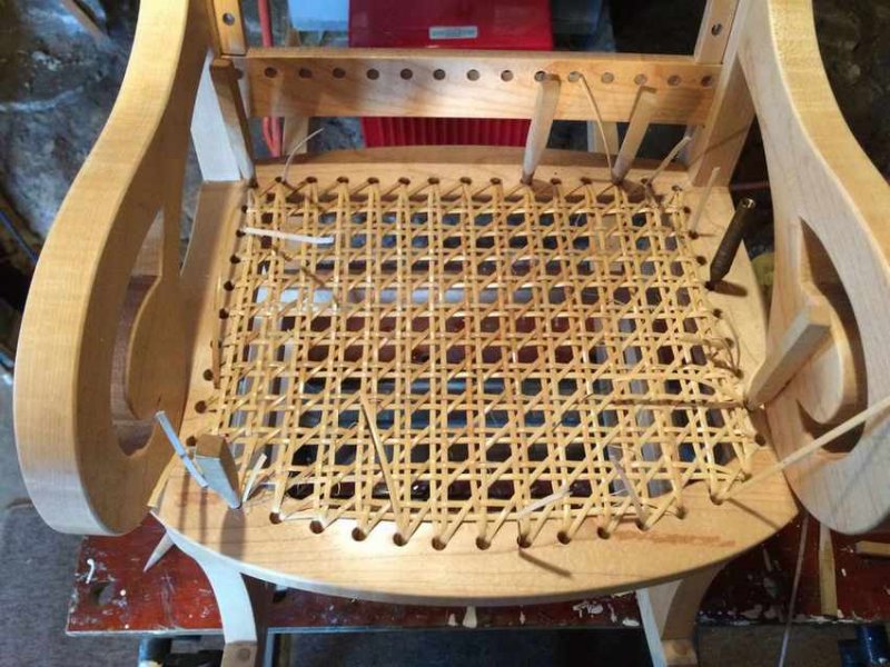 Сначала производится внешний осмотр предмета – можно ли его вообще починить. Если креслице еще не рассыпалось в труху, не сгнило и не съедено жуками, то все получится. Чаще всего ремонта требуют подлокотники, а сидение, полозья, спинка – полной замены. Кресло полостью разбирают, используя отвертку. Если имеются полностью «недееспособные» детали, вместо них лобзиком вырезаются другие, по форме неотличимые от старых.