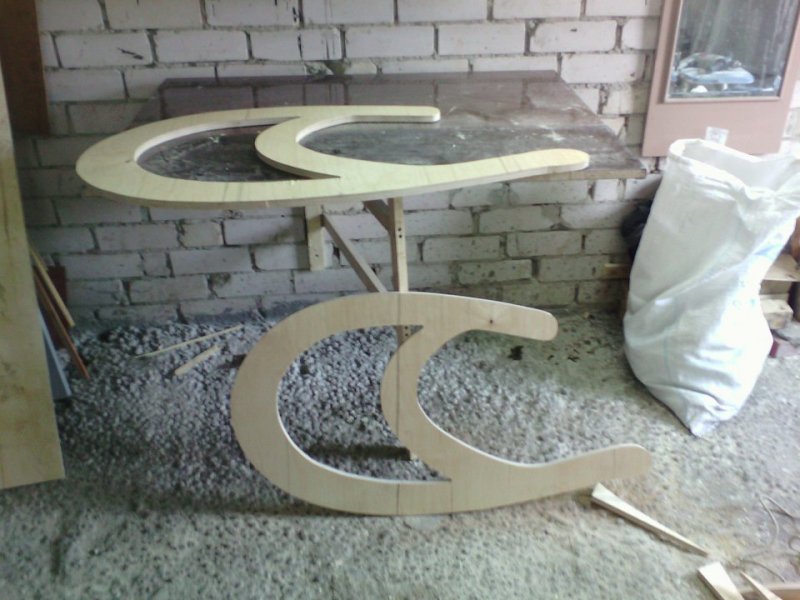 В ходе работы разрабатываются либо скачиваются из интернета подходящие варианты деталей, переносятся на доски. Потом все элементы вырезаются, шлифуются, по краю желательно снять фаску в несколько мм., чтобы не было острых углов. Изделие собирают, проверяют на устойчивость, разбирают, каждую деталь покрывают лаком, просушивают, собирают опять, при желании – украшают резными узорами, но желательно до покрытия лаком.