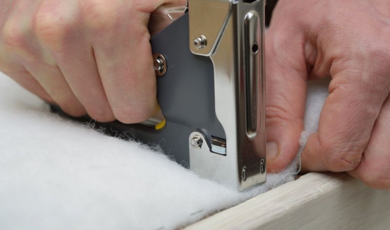 Когда набивка еще «в порядке», ее оставляют, в противном случае – целиком заменяют на новую. Подходящие детали выкраивают по размерам из поролона, углы которого аккуратно срезаются, чтобы было красивее. Набивку закрепляют по краю скобами из строительного степлера. Далее необходимо раскроить ткань – обычно из нее вырезается прямоугольник, углы которого, приходящиеся на соответствующие уголки мебели, аккуратно складываются, закрепляясь ниткой с иголкой. Все края необходимо подвернуть как минимум на один см, чтобы они не осыпались, закрепить степлером на изнаночной стороне изделия.